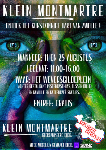 Klein Montmartre Zwolle vindt, met verschillende kunstenaars per dag, plaats op zondag 11 en 25 augustus van 11.00 tot 16.00 uur op het Weversgildeplein. Het evenement wordt mede mogelijk gemaakt door het Fonds Amateur Kunst en STANZ.